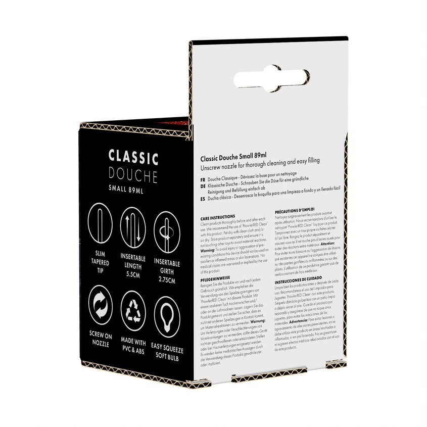 Prowler RED Bulb Douche is a classic douche. Featuring a PVC bulb and ABS plastic nozzle which can be cleaned easily and is simple to fill up and use. The base of the bulb is flat to enable standing it upright when needed. To fill, simply remove nozzle and hold under running water. Available in small, medium and large sizes in black.
